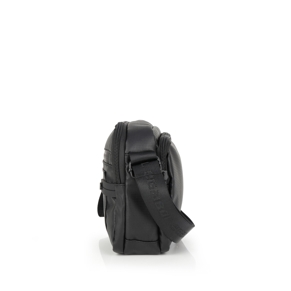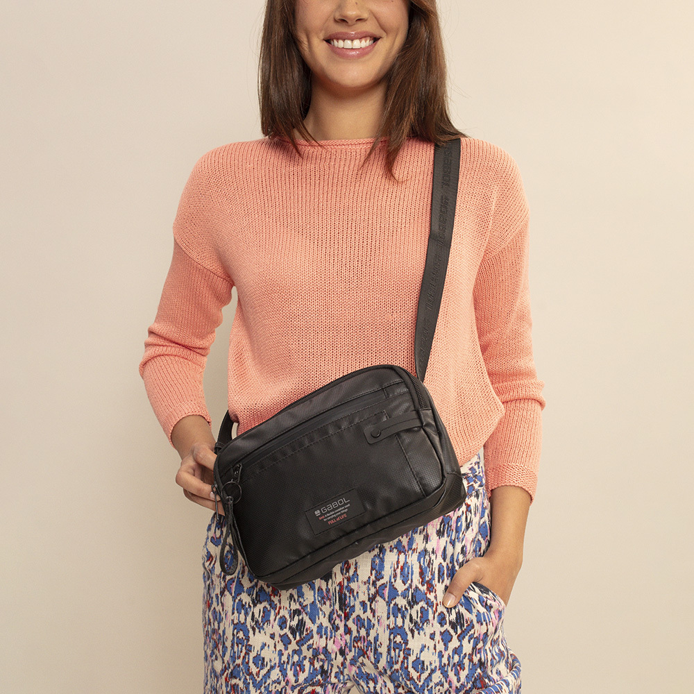 Muška torbica za struk izrađena od RPET (reciklirani polietilen tereftalat) platna otpornog na vodu, sa dovoljno prostora da se spakuju sve potrebne sitnice. Lako se uklapa u sve odevne kombinacije. U prednjem delu se nalazi džep koji na sebi ima otvor kroz koji se provlači kabl od slušalica, zatvara se zipom. Sa zadnje strane ima jednu pregradu, koja se takođe zatvara zipom. U centralnom delu ima dodatnu pregradu koja se takođe zatvara zipom. Dimenzije 20x12x7 cm. Boja: crna.